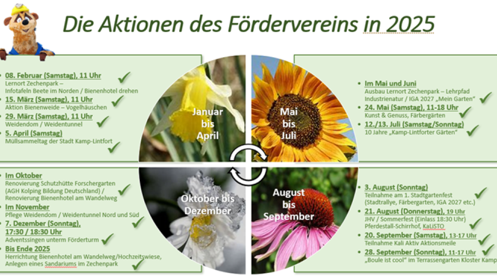 - Das Mitwirken zur Erreichung der Silber-Zertifizierung für die Stadt Kamp-Lintfort bei „Stadtgrün-Naturnah“.